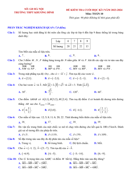 TRƯỜNG THPT KHƯƠNG ĐÌNH Môn: TOÁN 10