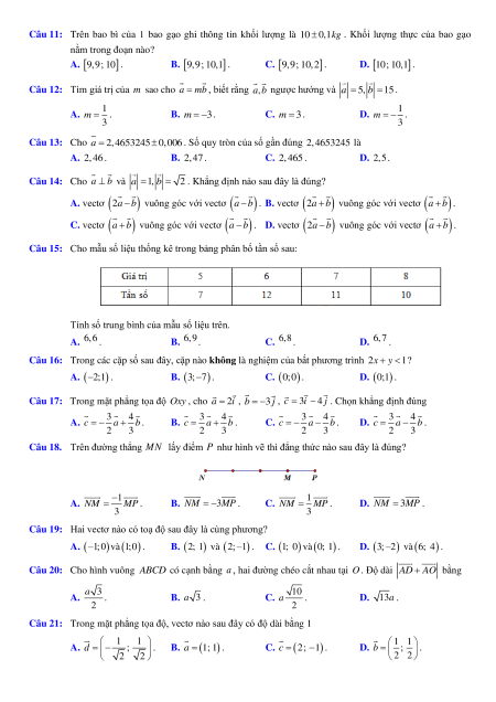 Câu 11: Trên bao bì của 1 bao gạo ghi thông tin khối lượng là 10 0,1kg . Khối lượng thực của bao gạo nằm trong đoạn nào?