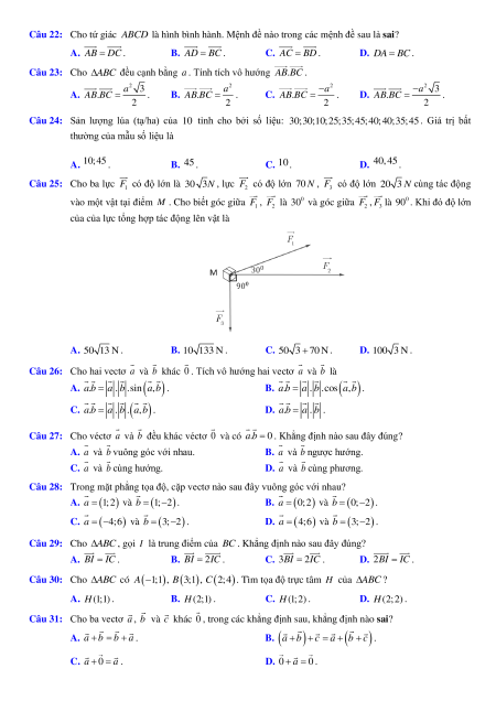 D. a = (4;6) và b = (3; 2 − ) . Câu 29: Cho ABC