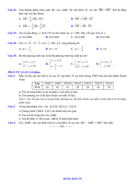Câu 1: Mẫu số liệu sau cho biết sĩ số của 07 lớp khối 10 tại một trường THPT trên địa bàn Quận Thanh Xuân:
