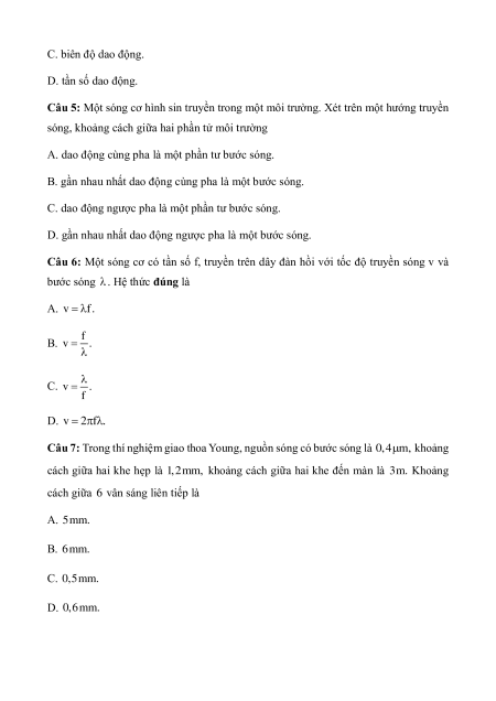 Câu 6: Một sóng cơ có tần số f, truyền trên dây đàn hồi với tốc độ truyền sóng v và