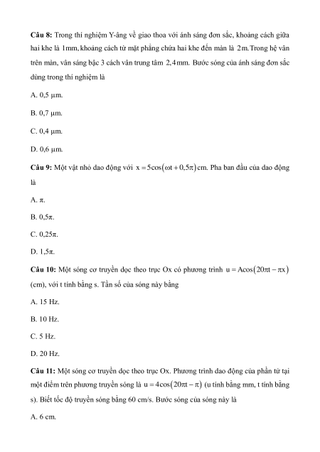 Câu 8: Trong thí nghiệm Y-âng về giao thoa với ánh sáng đơn sắc, khoảng cách giữa