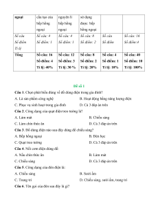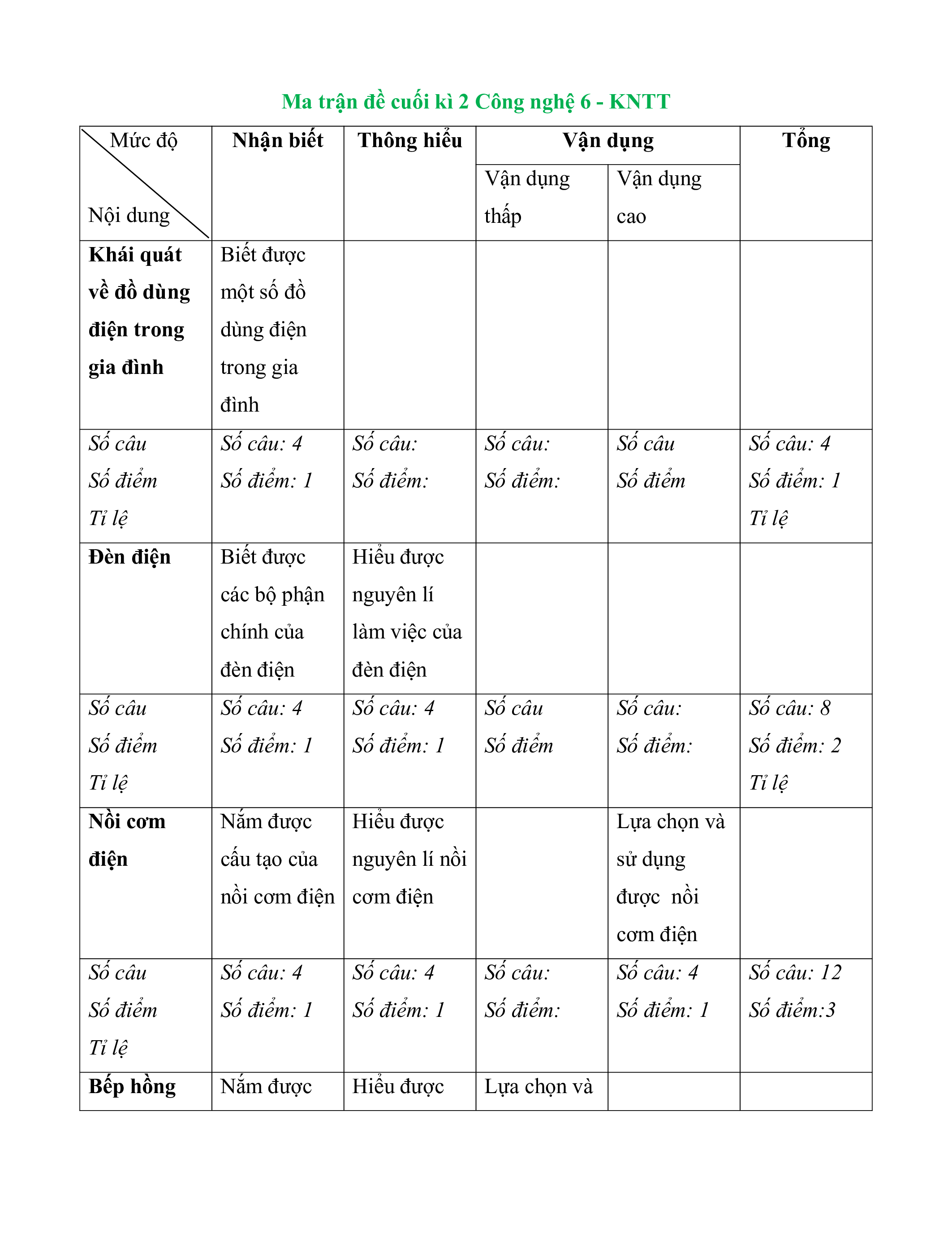 Ma trận đề cuối kì 2 Công nghệ 6 - KNTT Mức độ Nhận biết Thông hiểu Vận dụng Tổng Vận dụng Vận dụng Nội dung thấp cao Khái quát Biết được về đồ dùng một số đồ điện trong dùng điện gia đình trong gia đình Số câu Số câu: 4 Số câu: Số câu: Số câu Số câu: 4 Số điểm Số điểm: 1 Số điểm: Số điểm: Số điểm Số điểm: 1 Tỉ lệ Tỉ lệ Đèn điện Biết được Hiểu được các bộ phận nguyên lí chính của làm việc của đèn điện đèn điện Số câu Số câu: 4 Số câu: 4 Số câu Số câu: Số câu: 8 Số điểm Số điểm: 1 Số điểm: 1 Số điểm Số điểm: Số điểm: 2 Tỉ lệ Tỉ lệ Nồi cơm Nắm được Hiểu được Lựa chọn và điện cấu tạo của nguyên lí nồi sử dụng
