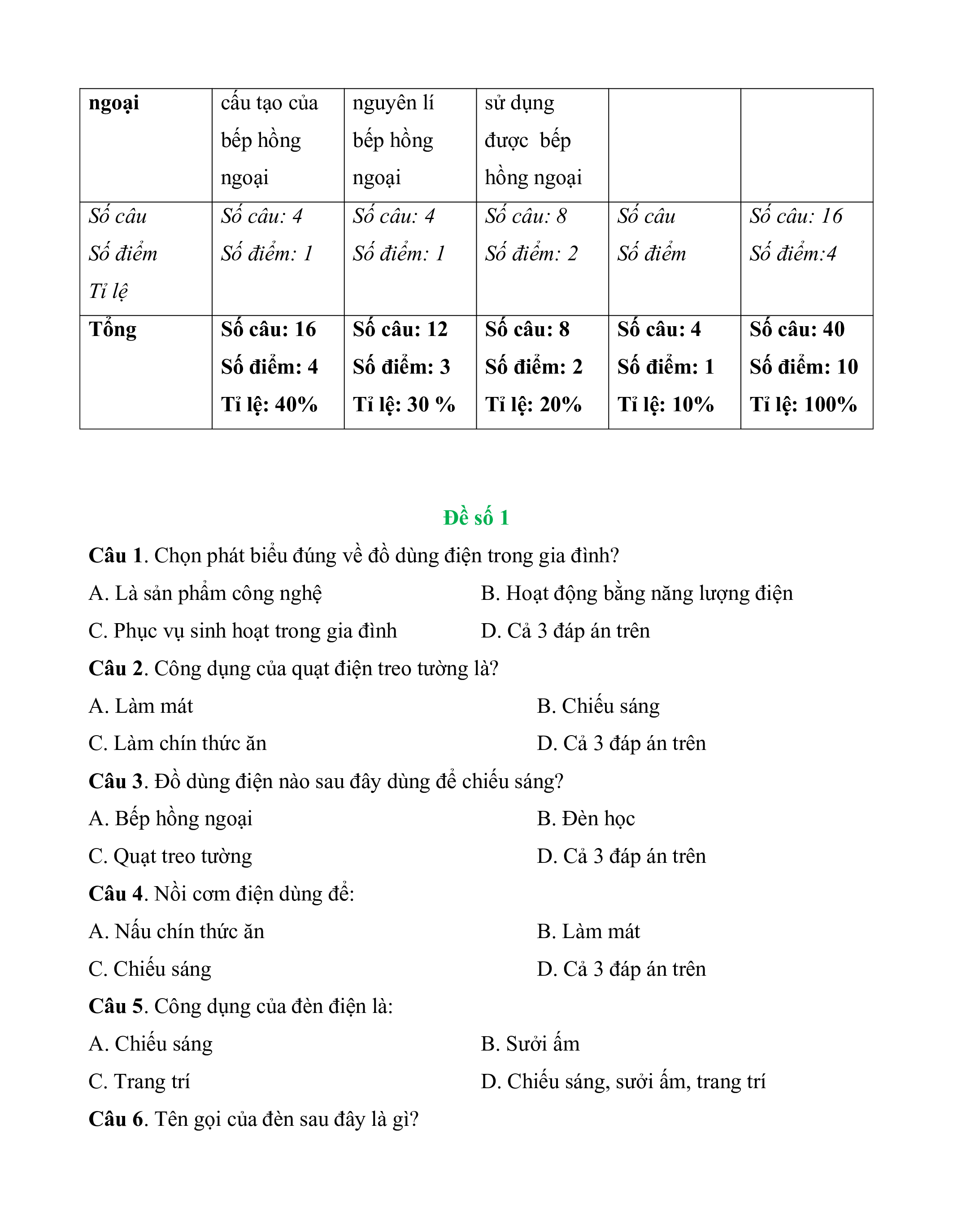 nồi cơm điện cơm điện được nồi cơm điện Số câu Số câu: 4 Số câu: 4 Số câu: Số câu: 4 Số câu: 12 Số điểm Số điểm: 1 Số điểm: 1 Số điểm: Số điểm: 1 Số điểm:3 Tỉ lệ Bếp hồng Nắm được Hiểu được Lựa chọn và ngoại cấu tạo của nguyên lí sử dụng bếp hồng bếp hồng được bếp ngoại ngoại hồng ngoại Số câu Số câu: 4 Số câu: 4 Số câu: 8 Số câu Số câu: 16 Số điểm Số điểm: 1 Số điểm: 1 Số điểm: 2 Số điểm Số điểm:4 Tỉ lệ Tổng Số câu: 16 Số câu: 12 Số câu: 8 Số câu: 4 Số câu: 40 Số điểm: 4 Số điểm: 3 Số điểm: 2 Số điểm: 1 Số điểm: 10 Tỉ lệ: 40%
