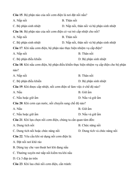 Câu 14. Cấu tạo nồi cơm điện có: A. Nắp nồi B. Thân nồi C. Bộ phận sinh nhiệt