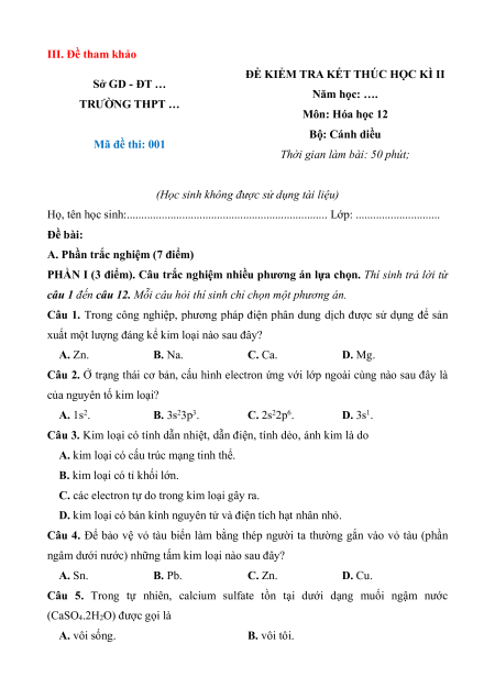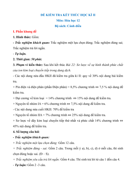 - Tailieugiaovien.com.vn giới thiệu bộ 6 đề cuối kì 2 gồm đầy đủ ma trận và lời giải chi tiết môn Hóa học 12 Cánh diều mới nhất nhằm giúp Giáo viên có thêm tài liệu tham khảo ra đề thi Hóa học 12.