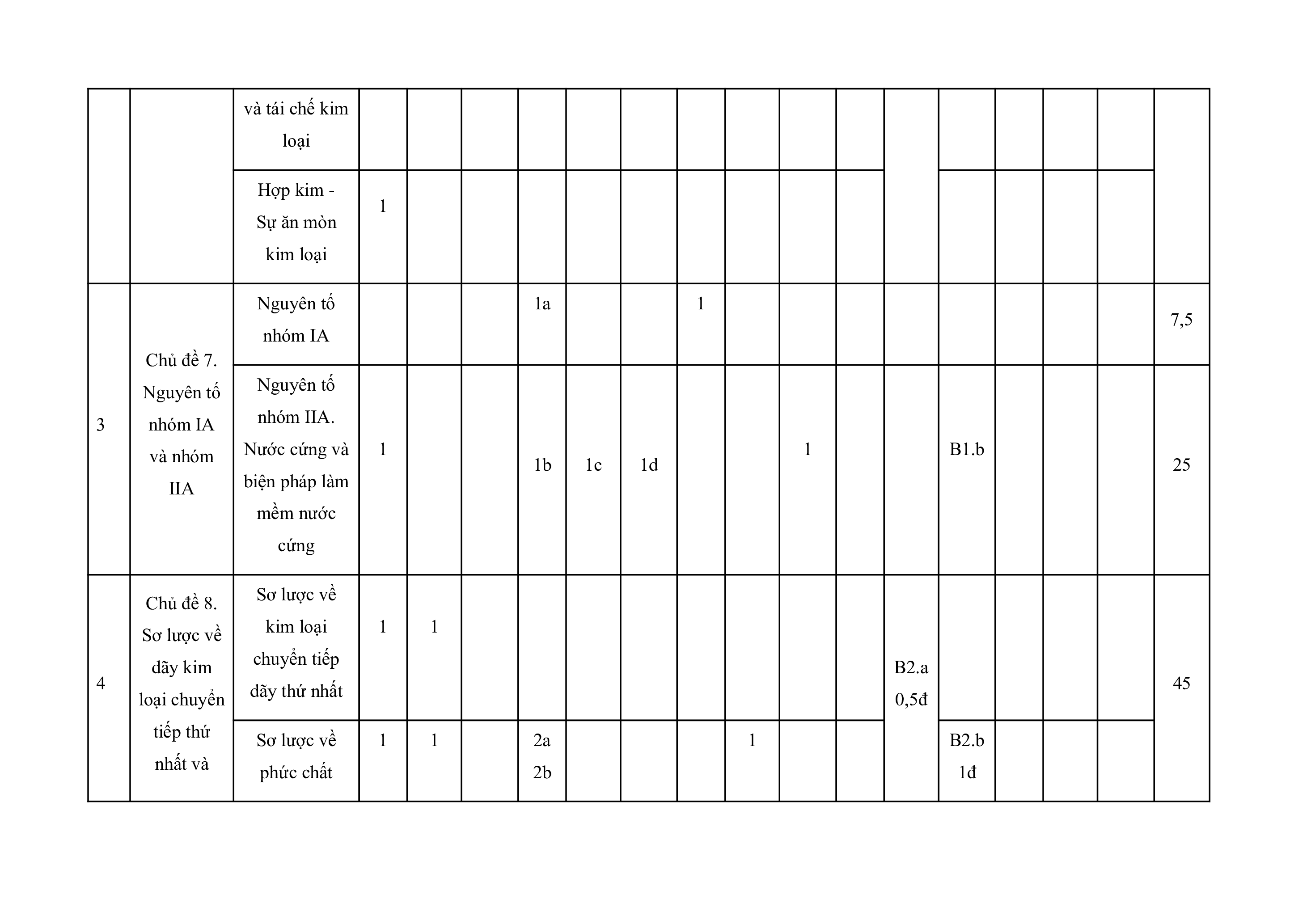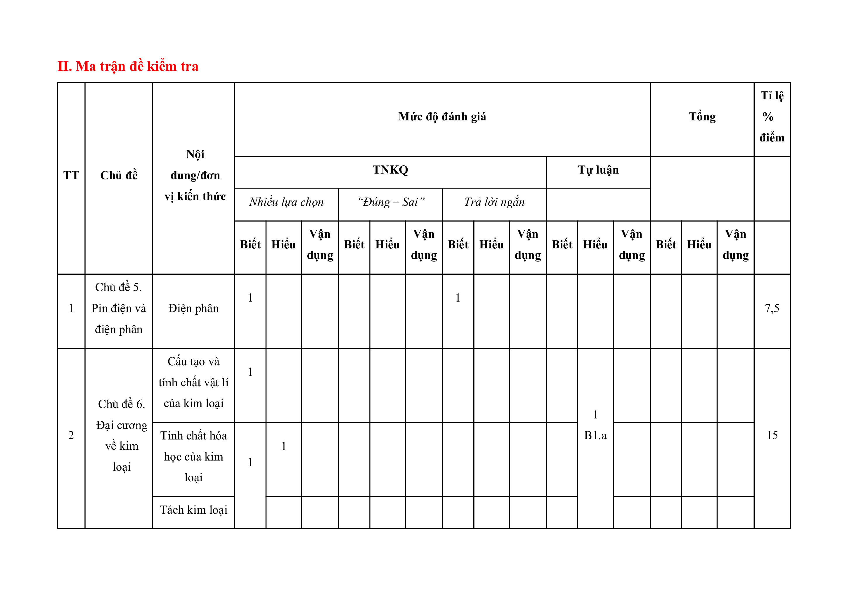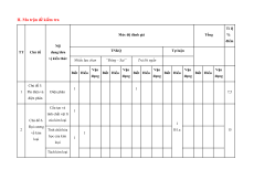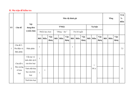 II. Ma trận đề kiểm tra Tỉ lệ Mức độ đánh giá Tổng % điểm Nội TT Chủ đề dung/đơn TNKQ Tự luận vi kiến thức Nhiều lựa chọn “Đúng – Sai” Trả lời ngắn Vận Vận Vận Vận Vận Biết Hiểu Biết Hiểu Biết Hiểu Biết Hiểu Biết Hiểu dụng dụng dụng dụng dụng Chủ đề 5. 1 1 1 Pin điện và Điện phân 7,5 điện phân Cấu tạo và 1 tính chất vật lí Chủ đề 6. của kim loại 1 Đại cương 2 Tính chất hóa B1.a 15 về kim 1 học của kim loại 1 loại Tách kim loại và tái chế kim loại Hợp kim - 1 Sự ăn mòn kim loại Nguyên tố 1a 1 7,5 nhóm IA Chủ đề 7. Nguyên tố Nguyên tố 3 nhóm IA nhóm IIA. và nhóm Nước cứng và 1 1 B1.b 1b 1c 1d 25 IIA biện pháp làm mềm nước cứng Chủ đề 8. Sơ lược về Sơ lược về kim loại 1 1 dãy kim chuyển tiếp B2.a 4 45
