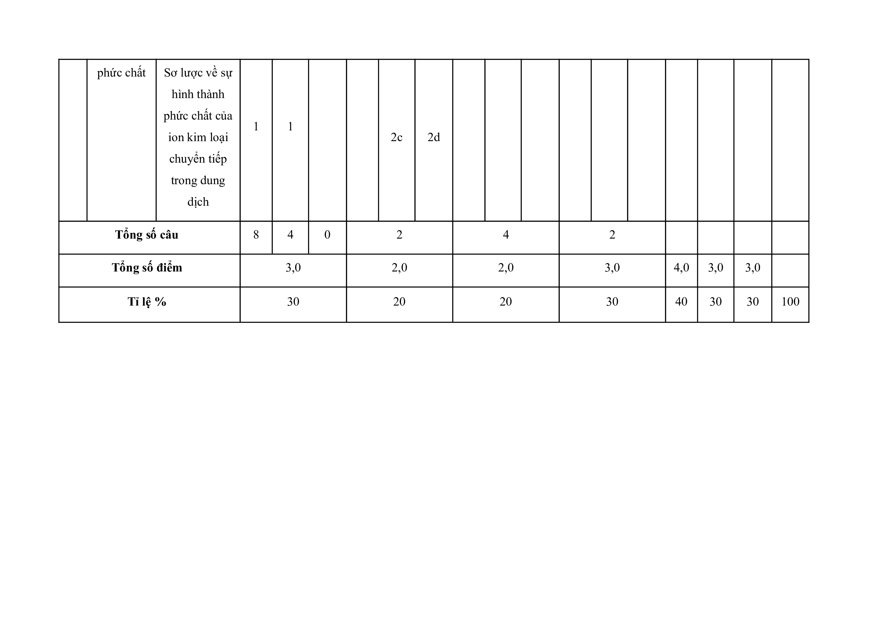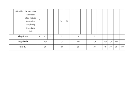 loại chuyển dãy thứ nhất 0,5đ tiếp thứ Sơ lược về 1 1 2a 1 B2.b nhất và phức chất 2b 1đ phức chất Sơ lược về sự hình thành phức chất của 1 1 ion kim loại 2c 2d chuyển tiếp trong dung dịch Tổng số câu 8 4 0 2 4 2 Tổng số điểm 3,0 2,0 2,0 3,0 4,0 3,0 3,0 Tỉ lệ % 30 20 20 30 40 30 30 100