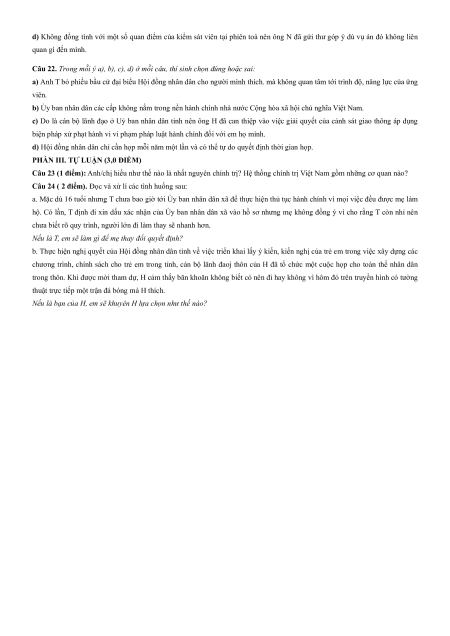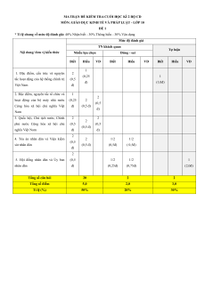 5. Hội đồng nhân dân và Ủy ban (0,5 1/2 1/2 1 nhân dân đ) (0,25đ) (0,75đ) (2,0đ) Tổng số câu hỏi 20 2 2 Tổng số điểm 5,0 2,0 3,0 Tỉ lệ (%) 50% 20% 30%