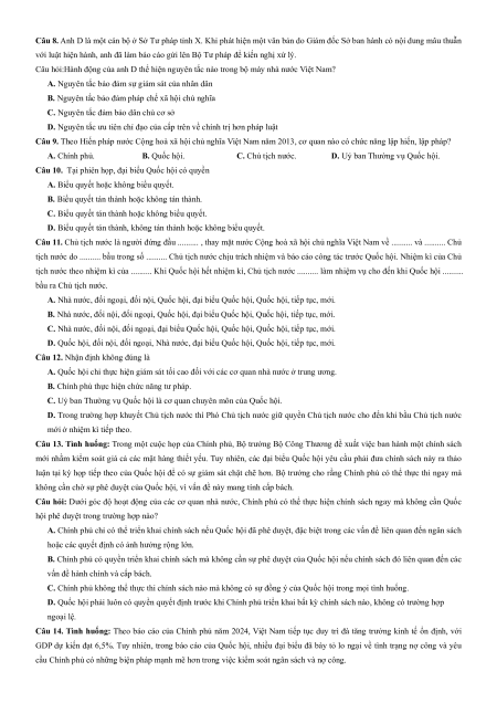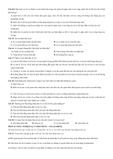 Câu 9. Theo Hiến pháp nước Cộng hoà xã hội chủ nghĩa Việt Nam năm 2013, cơ quan nào có chức năng lập hiến, lập pháp? A. Chính phủ. B. Quốc hội.