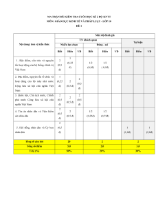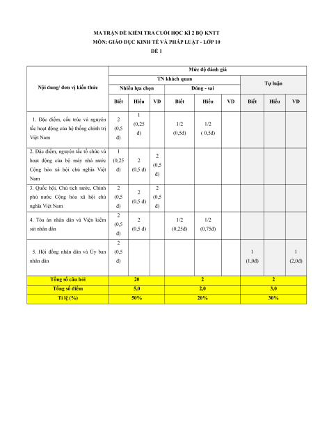 5. Hội đồng nhân dân và Ủy ban (0,5 1 1 nhân dân đ) (1,0đ) (2,0đ) Tổng số câu hỏi 20 2 2 Tổng số điểm 5,0 2,0 3,0 Tỉ lệ (%) 50% 20% 30%