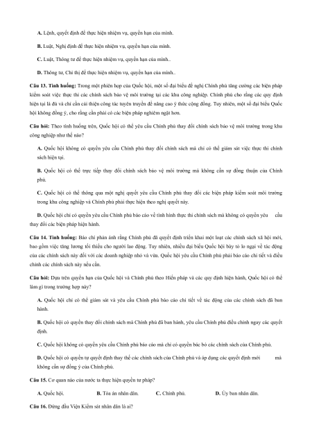 Câu 13. Tình huống: Trong một phiên họp của Quốc hội, một số đại biểu đề nghị Chính phủ tăng cường các biện pháp