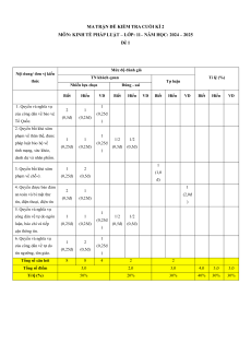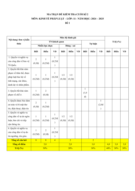 MÔN: KINH TẾ PHÁP LUẬT – LỚP: 11– NĂM HỌC: 2024 – 2025 Đề 1 Mức độ đánh giá