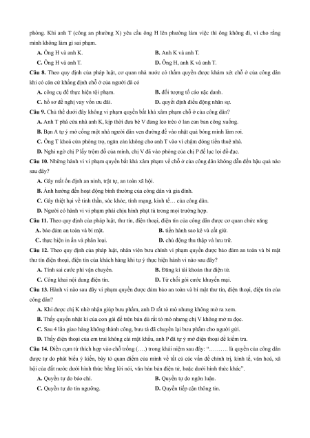 Câu 13. Hành vi nào sau đây vi phạm quyền được đảm bảo an toàn và bí mật thư tín, điện thoại, điện tín của công dân?