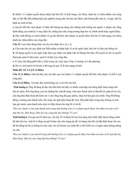 phạm về thân thể, được 1 1 1 1/2 1/2 pháp luật bảo hộ về (0,25đ (0,25đ) (0,25đ) (0,5đ) (0,5đ) tính mạng, sức khỏe, ) danh dự và nhân phẩm. 1 3. Quyền bất khả xâm 1 2 (1,0 phạm về chỗ ở. (0,25đ) (0,5đ) đ)