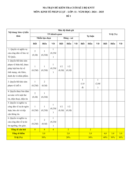 MÔN: KINH TẾ PHÁP LUẬT – LỚP: 11– NĂM HỌC: 2024 – 2025 Đề 1 Mức độ đánh giá