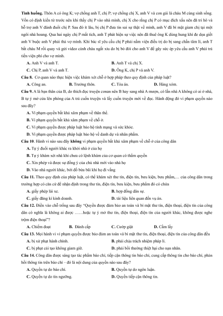Câu 8. Cơ quan nào thực hiện việc khám xét chỗ ở hợp pháp theo quy định của pháp luật? A. Công an. B. Trưởng thôn. C. Tòa án. D. Hàng xóm.