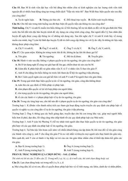 Câu 17. Các quan niệm: Không ăn trứng trước khi đi thi, không ăn lạc khi thi được gọi là? A. Tôn giáo. B. Tín ngưỡng. C. Mê tín dị đoan. D. Truyền giáo.