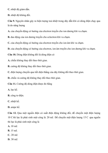 Câu 9. Nguyên nhân gây ra hiện tượng toả nhiệt trong dây dẫn khi có dòng điện chạy qua là do năng lượng