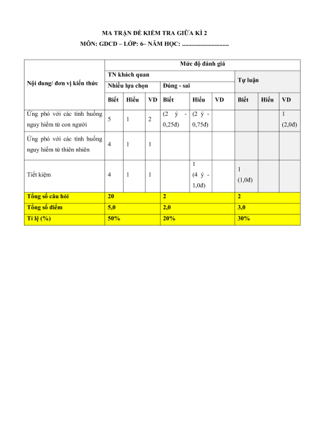Ứng phó với các tình huống 4 1 1 nguy hiểm từ thiên nhiên 1 1 Tiết kiệm 4 1 1 (4 ý - (1,0đ) 1,0đ) Tổng số câu hỏi 20 2 2 Tổng số điểm 5,0 2,0 3,0 Tỉ lệ (%) 50% 20% 30%