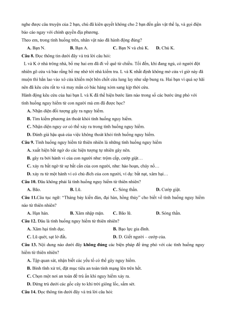 Câu 10. Đâu không phải là tình huống nguy hiểm từ thiên nhiên? A. Bão. B. Lũ. C. Sóng thần. D. Cướp giật.