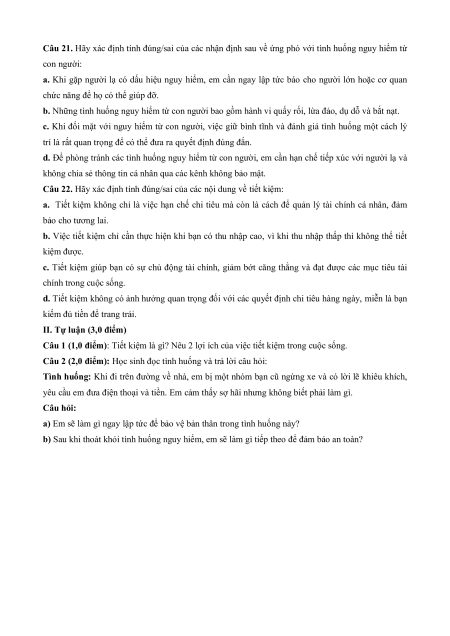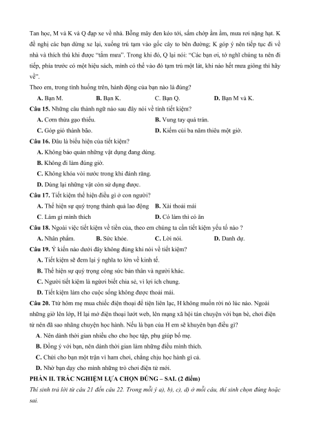 Câu 18. Ngoài việc tiết kiệm về tiền của, theo em chúng ta cần tiết kiệm yếu tố nào ? A. Nhân phẩm. B. Sức khỏe. C. Lời nói. D. Danh dự.