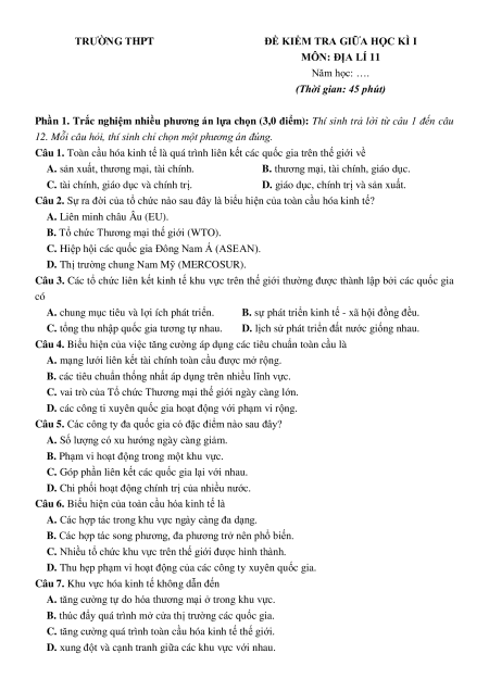 ĐỀ KIỂM TRA GIỮA HỌC KÌ I MÔN: ĐỊA LÍ 11 Năm học: ….