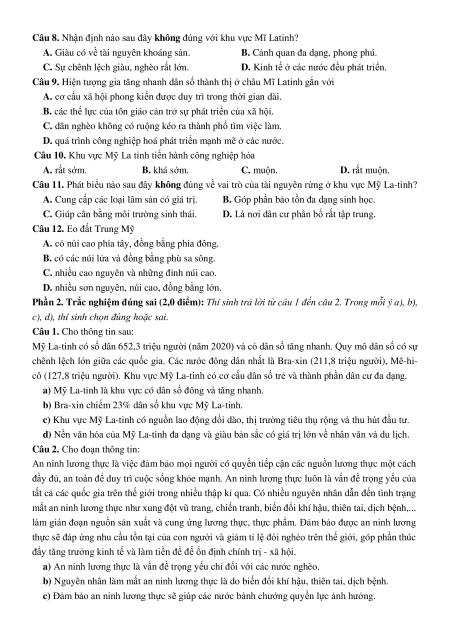 Câu 8. Nhận định nào sau đây không đúng với khu vực Mĩ Latinh?