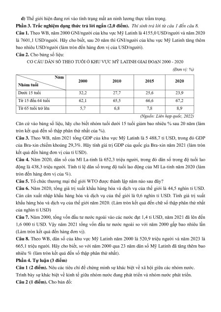 Câu 4. Năm 2020, dân số của Mĩ La-tinh là 652,3 triệu người, trong đó dân số trong độ tuổi lao
