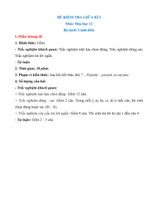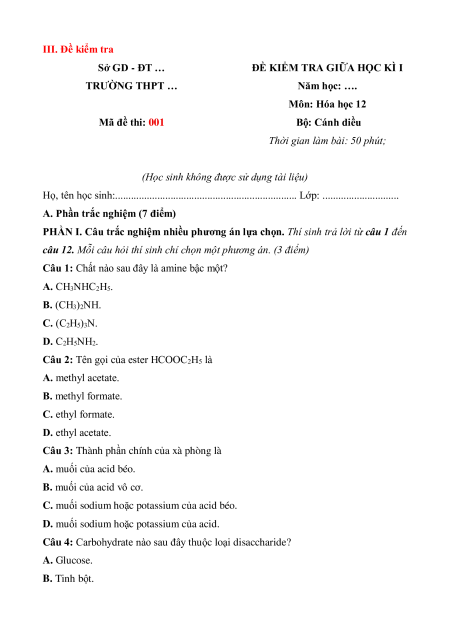 ĐỀ KIỂM TRA GIỮA HỌC KÌ I TRƯỜNG THPT … Năm học: …. Môn: Hóa học 12 Mã đề thi: 001 Bộ: Cánh diều