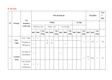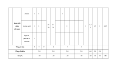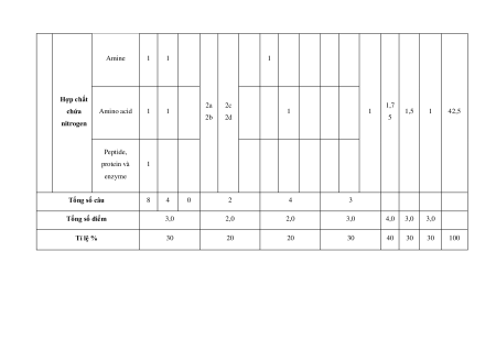 Mức độ đánh giá Tổng điểm % điểm Nội TNKQ Tự luận TT Chương dung/đơn vi ̣kiến thức Nhiều lựa chọn “Đúng – Sai” Trả lời ngắn Vận Vận Vận Vận Vận Biết Hiểu Biết Hiểu Biết Hiểu Biết Hiểu Biết Hiểu dụng dụng dụng dụng dụng Ester - Lipid 1 1 Ester - 1a 1c 1 1 1 1,25 1 32,5 Lipid Xà phòng và 1b 1d 1 1 chất giặt rửa Giới thiệu về 2 1 carbohydrate. Carbohy 1,2 2 1 0,25 1 25 drate 5 Tính chất hóa học của 1 1 carbohydrate Amine 1 1 1 Hợp chất 2a 2c 1,7 chứa Amino acid 1 1 1 1 1,5 1 42,5 2b 2d 5 nitrogen Peptide, protein và 1 enzyme Tổng số câu 8 4 0 2 4 3 Tổng số điểm 3,0 2,0 2,0 3,0 4,0 3,0 3,0 Tỉ lệ % 30 20 20 30 40 30 30 100 III. Đề kiểm tra Sở GD - ĐT …