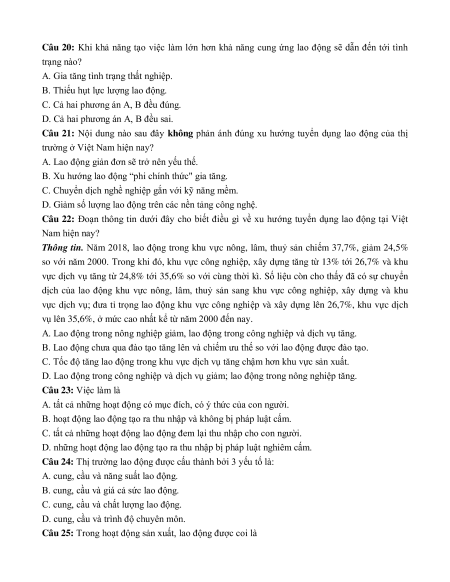 Câu 18: Nội dung nào dưới đây không phản ánh đúng nguyên nhân chủ quan dẫn đến tình trạng thất nghiệp?