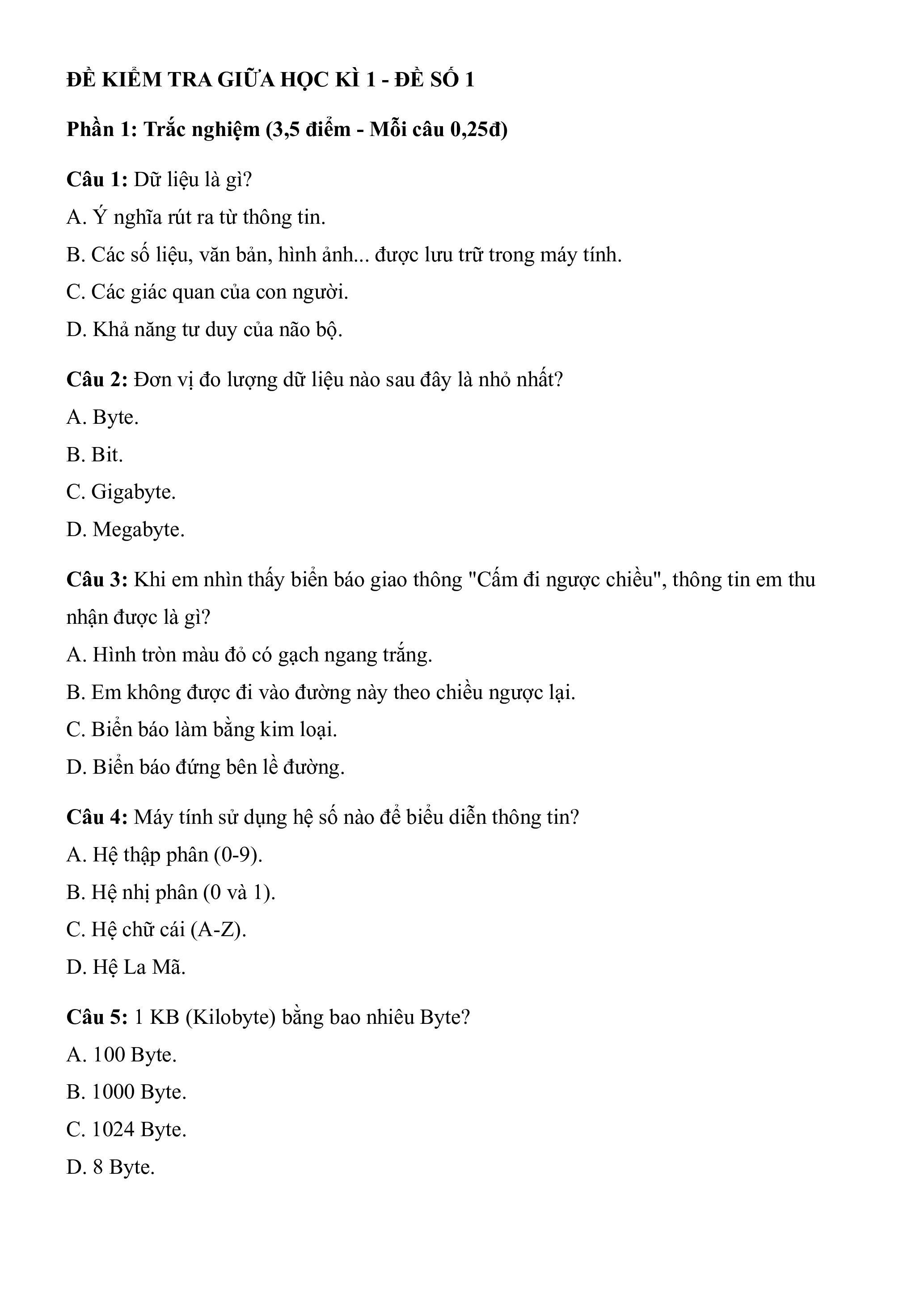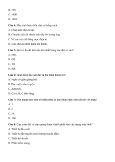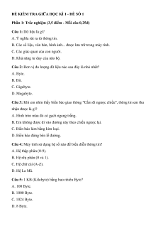 Câu 5: 1 KB (Kilobyte) bằng bao nhiêu Byte? A. 100 Byte. B. 1000 Byte. C. 1024 Byte. D. 8 Byte.