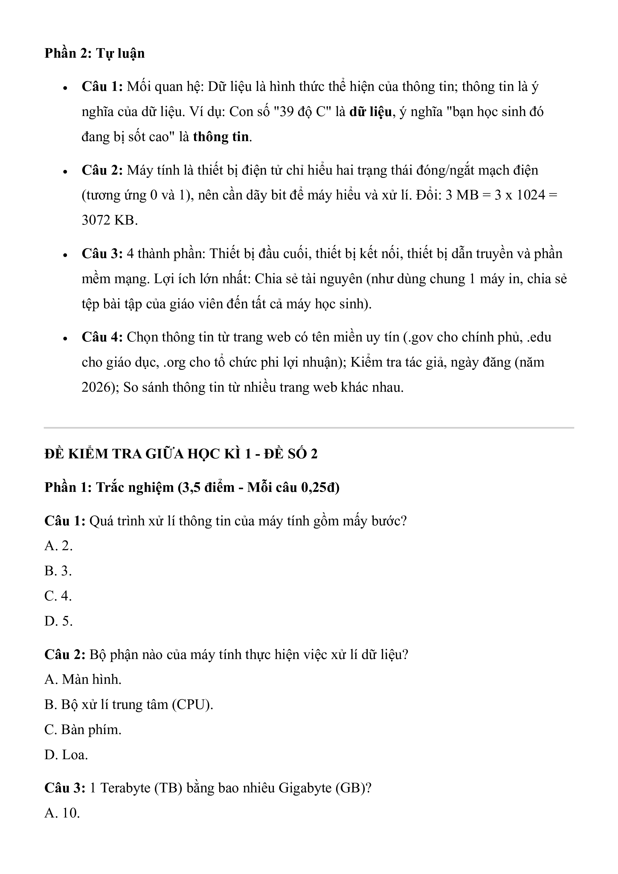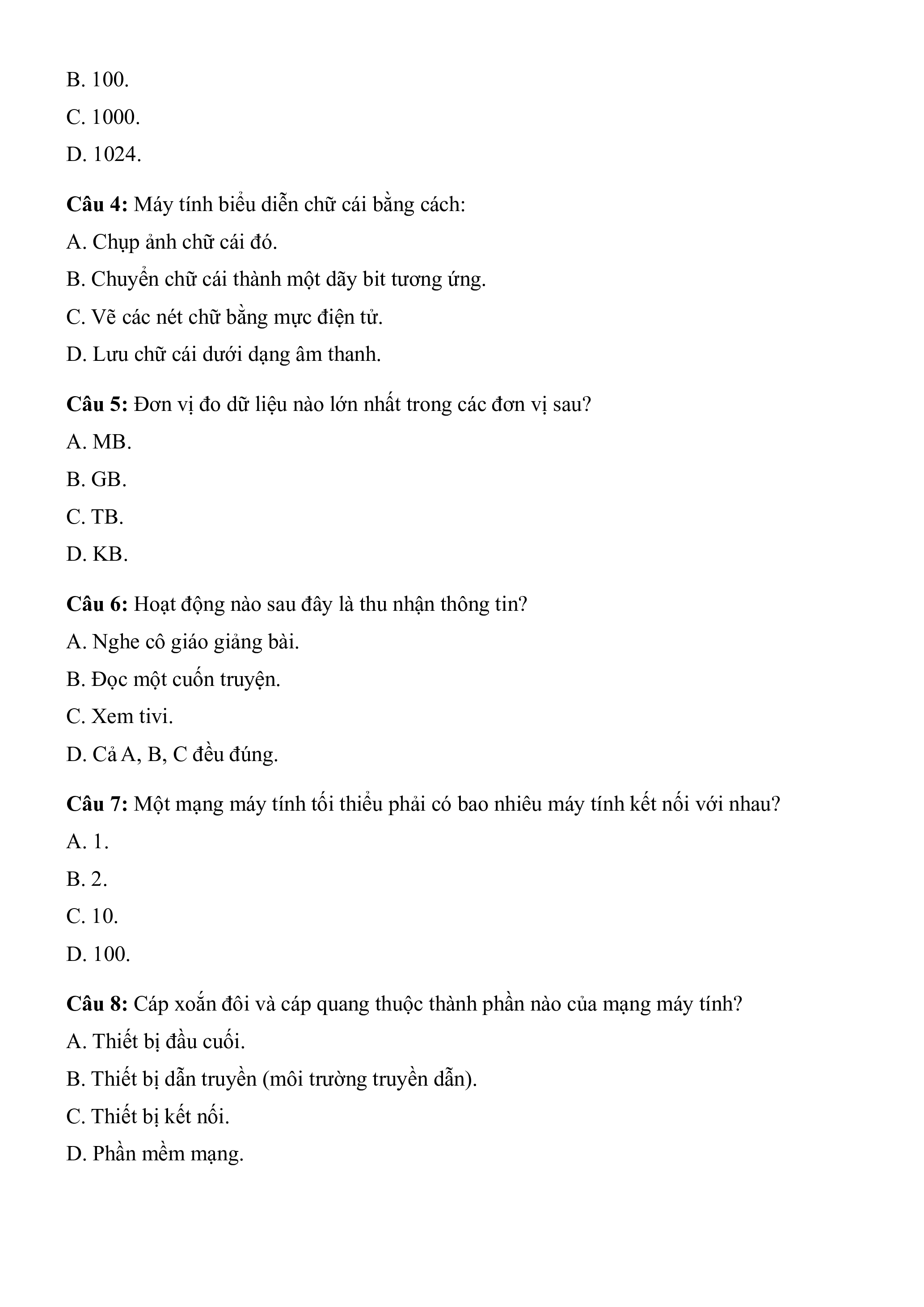 Câu 3: 1 Terabyte (TB) bằng bao nhiêu Gigabyte (GB)? A. 10.