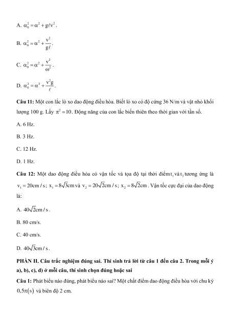 Câu 2: Một vật dao động điều hòa có gia tốc a, vận tốc v, tần số góc . 2 2 Đặt 1 v a , , thì có biểu thức: 2 2 2 2 A A