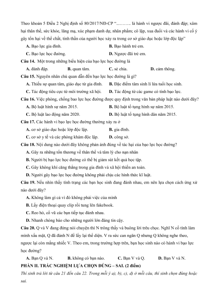 Câu 14. Một trong những biểu hiện của bạo lực học đường là A. đánh đập. B. quan tâm. C. sẻ chia. D. cảm thông.