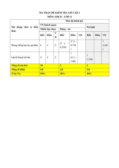 Phòng chống bạo lực gia đình 6 3 2 0,75đ (2,0đ 0,25đ) ) ) 1 1 Lập kế hoạch chi tiêu 4 2 2 (4 ý - (1,0đ) 1,0đ) Tổng số câu hỏi 20 2 2 Tổng số điểm 5,0 2,0 3,0 Tỉ lệ (%) 50% 20% 30%