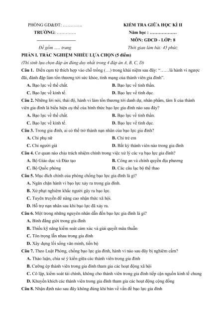 Năm học : ……………… MÔN: GDCD - LỚP: 8 Đề gồm …. trang