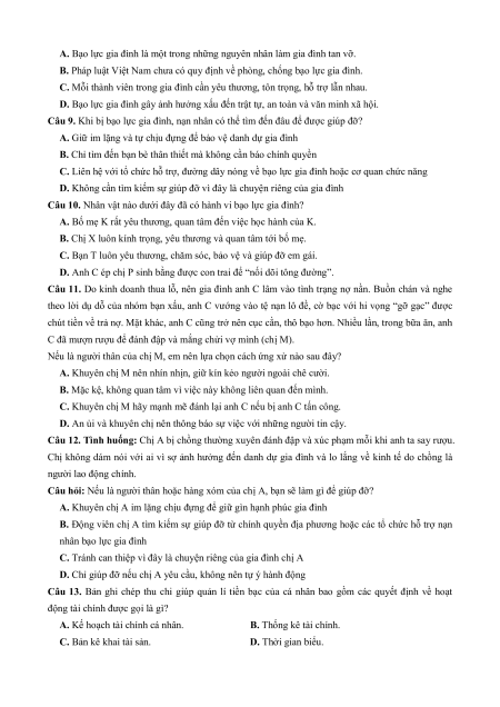Câu 3. Trong gia đình, ai có thể trở thành nạn nhân của bạo lực gia đình? A. Chỉ phụ nữ B. Chỉ trẻ em C. Chỉ người già