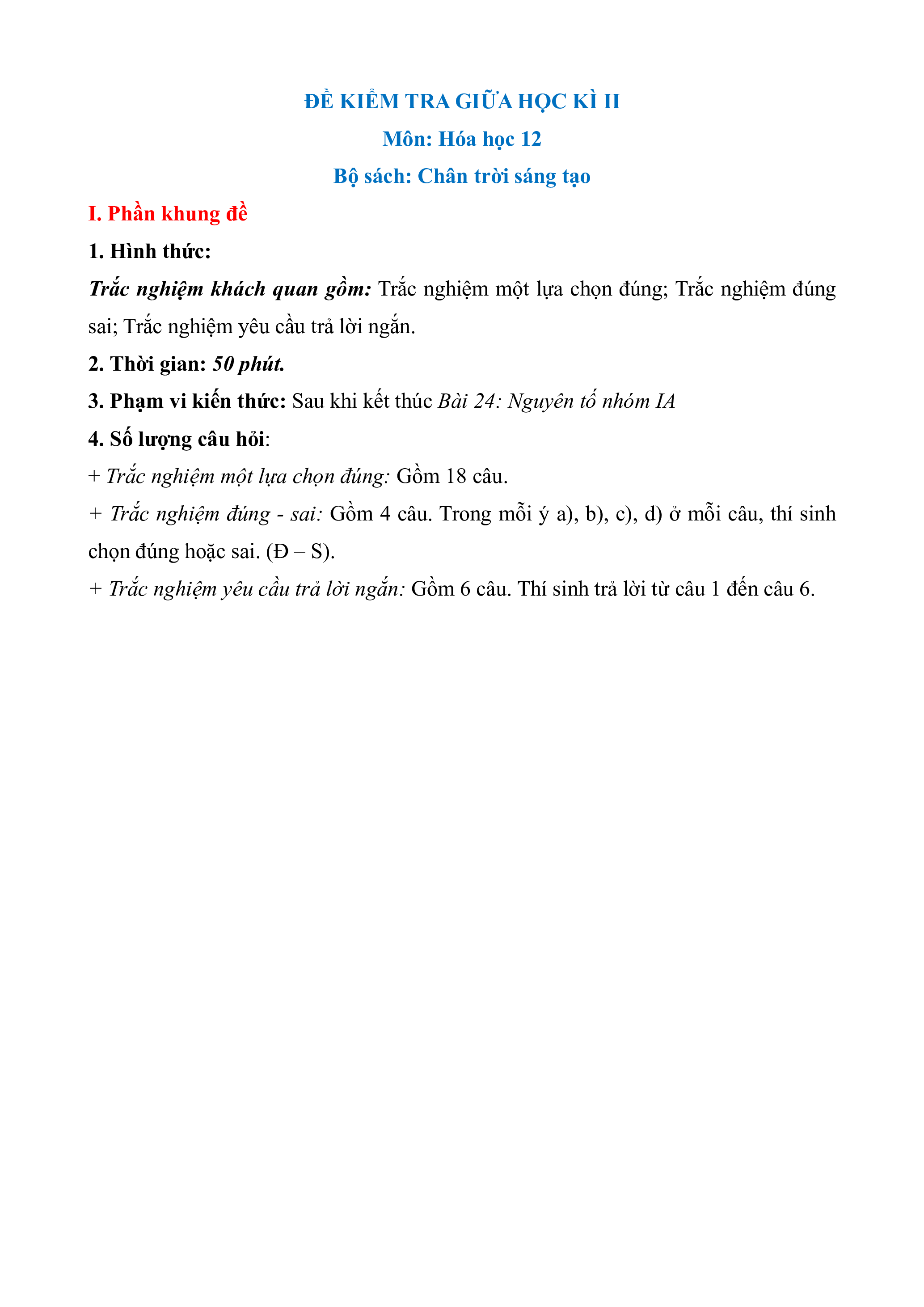 - Tailieugiaovien.com.vn giới thiệu bộ 6 đề giữa kì 2 gồm 3 đề thi theo 3 dạng thức trắc nghiệm và 3 đề thi theo cấu trúc mới môn Hóa học 12 Chân trời sáng tạo mới nhất năm 2026 nhằm giúp Giáo viên có thêm tài liệu tham khảo ra đề thi Hóa học 12.