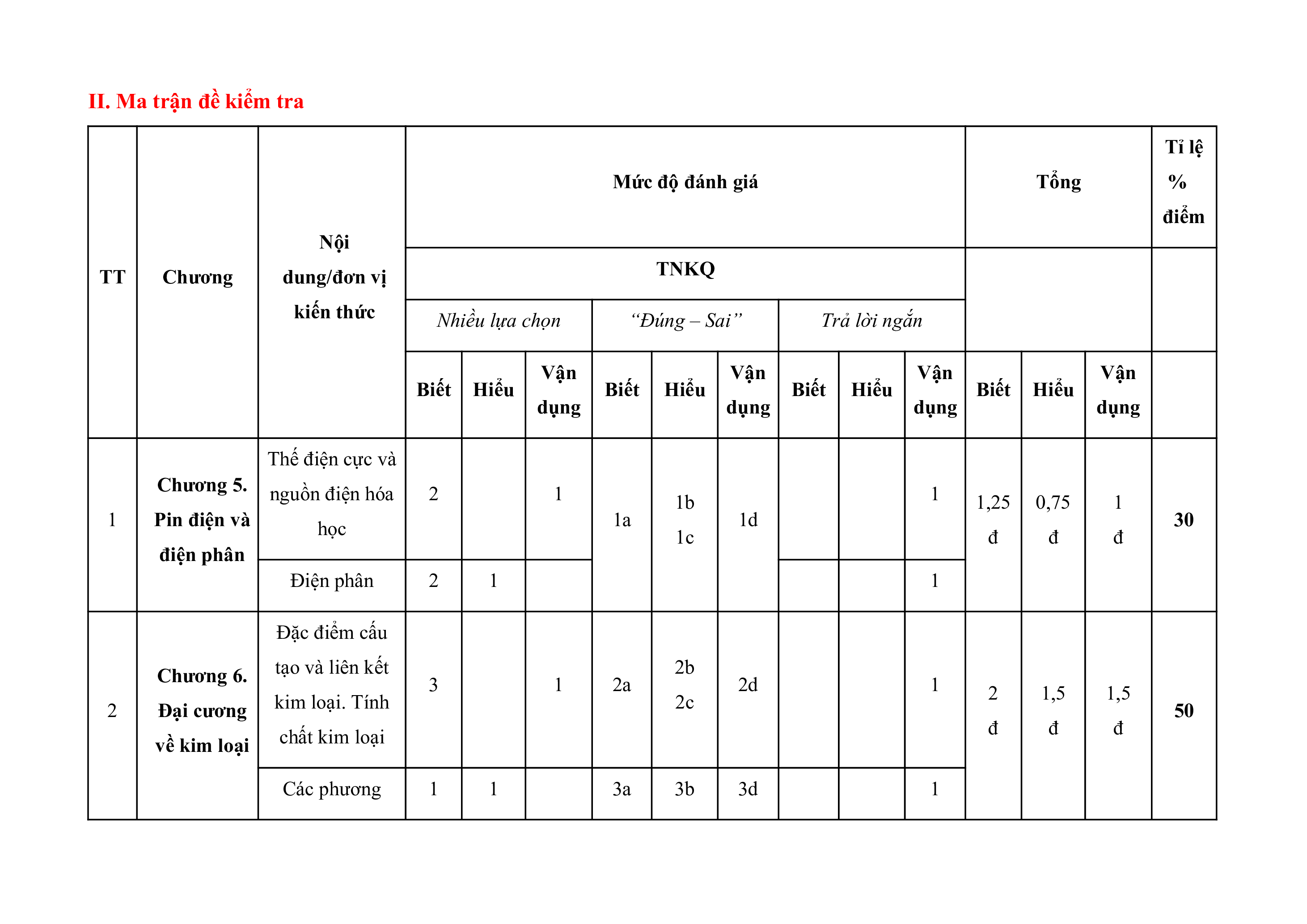 II. Ma trận đề kiểm tra Tỉ lệ Mức độ đánh giá Tổng % điểm Nội TT Chương dung/đơn vi TNKQ kiến thức Nhiều lựa chọn “Đúng – Sai” Trả lời ngắn Vận Vận Vận Vận Biết Hiểu Biết Hiểu Biết Hiểu Biết Hiểu dụng dụng dụng dụng Thế điện cực và