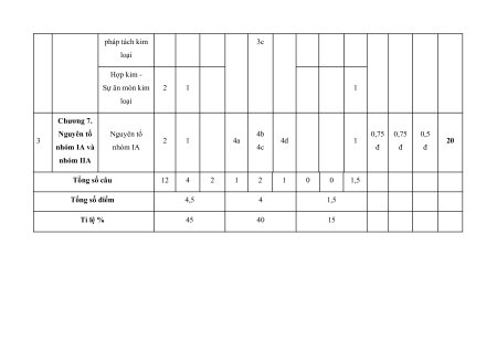 Chương 6. tạo và liên kết 2b 3 1 2a 2d 1 2 1,5 1,5 2 Đại cương kim loại. Tính 2c 50 đ đ đ về kim loại chất kim loại Các phương 1 1 3a 3b 3d 1 pháp tách kim 3c loại Hợp kim - Sự ăn mòn kim 2 1 1 loại Chương 7. Nguyên tố Nguyên tố 4b 0,75 0,75 0,5 3 2 1 4a 4d 1 20 nhóm IA và nhóm IA 4c đ đ đ nhóm IIA Tổng số câu 12 4 2 1 2 1 0 0 1,5 Tổng số điểm 4,5 4 1,5 Tỉ lệ % 45 40 15 III. Đề tham khảo