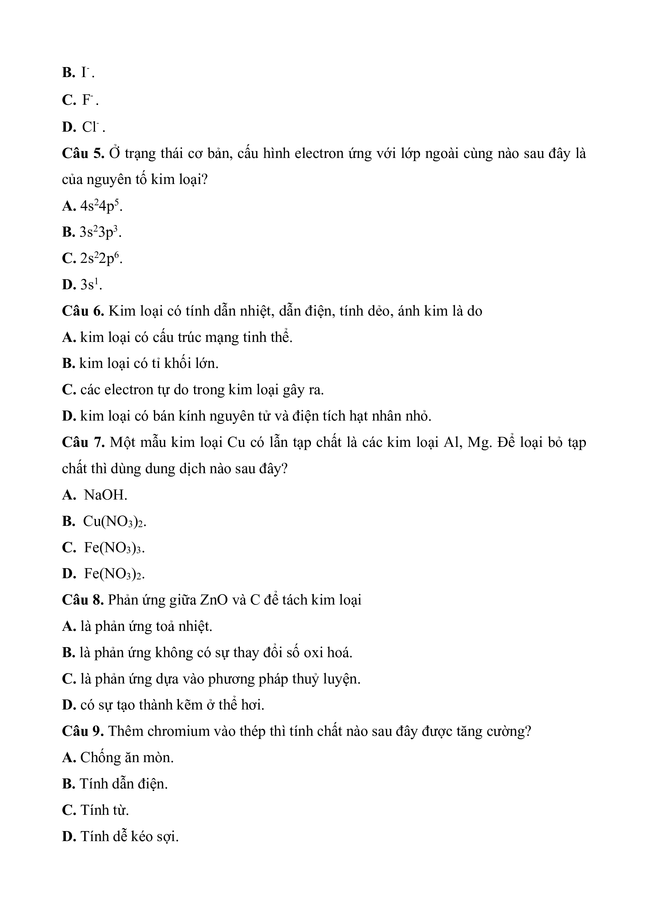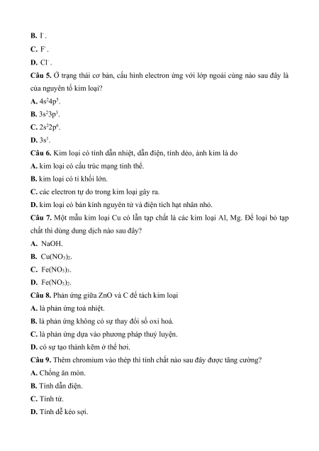 Câu 4. Ion halide hầu như không bị điện phân trong dung dịch là A. - Br .