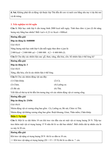 d. Động vật thuộc lớp Thú đều có lông mao bao phủ cơ thể, đẻ con và nuôi con bằng sữa mẹ. Hướng dẫn giải