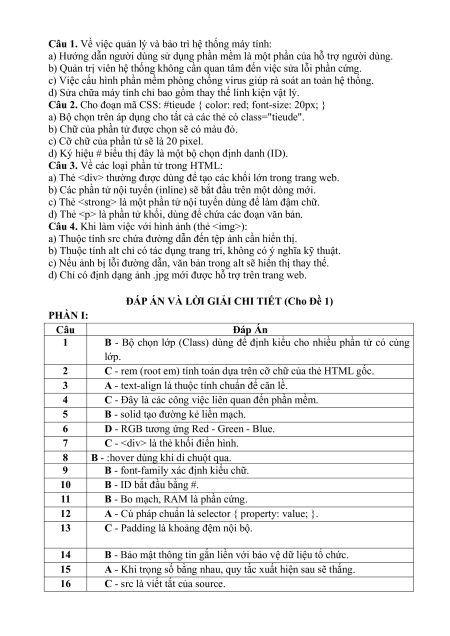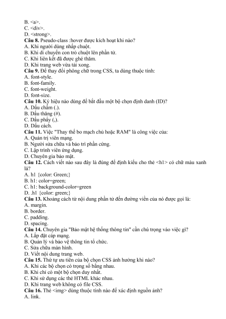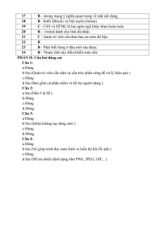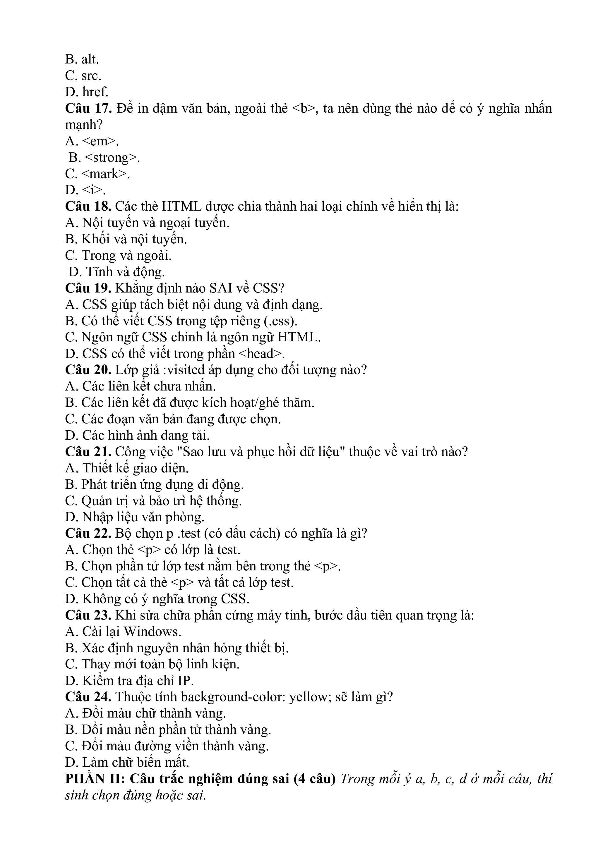 Câu 17. Để in đậm văn bản, ngoài thẻ , ta nên dùng thẻ nào để có ý nghĩa nhấn mạnh? A. . B. . C. . D. .