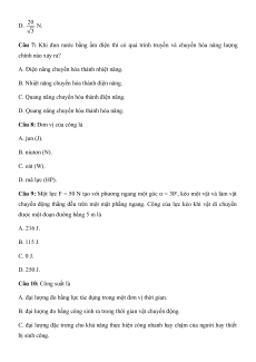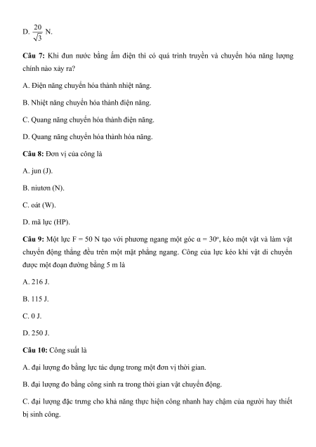 Câu 8: Đơn vị của công là A. jun (J). B. niutơn (N). C. oát (W). D. mã lực (HP).