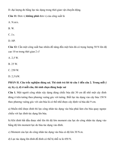 Câu 11: Đơn vị không phải đơn vị của công suất là A. N.m/s. B. W. C. J.s. D. HP.