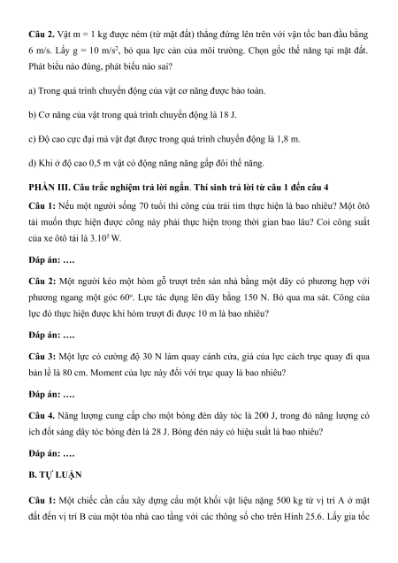 cao 10 m trong thời gian 2 s? A. 2,5 W. B. 25 W. C. 250 W. D. 2,5 kW.
