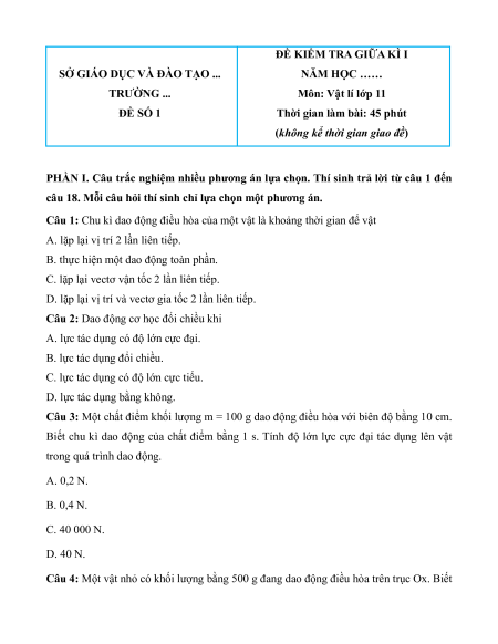 Môn: Vật lí lớp 11 ĐỀ SỐ 1