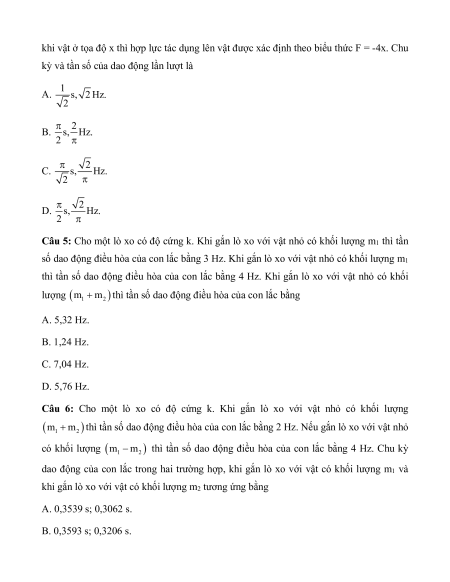 Câu 5: Cho một lò xo có độ cứng k. Khi gắn lò xo với vật nhỏ có khối lượng m1 thì tần